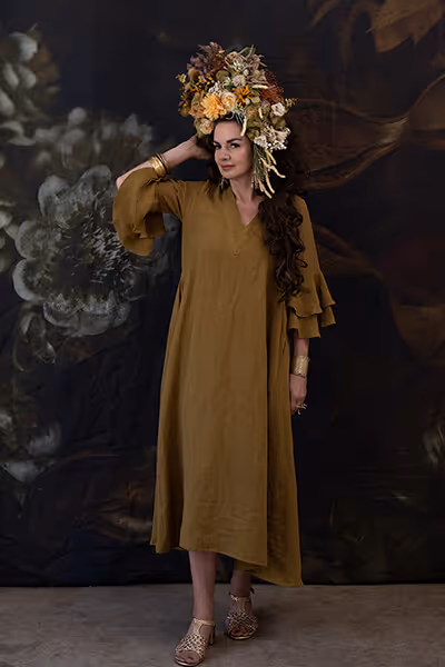 The Louella has transformed from top into a fabulous dress in Antique Black. This is a dress for all-day glamour - quintessential Lynda Gardener. A maxi dress in every way with dramatic gathering in the sleeves and a neckline that can be worn coquettishly off one shoulder.