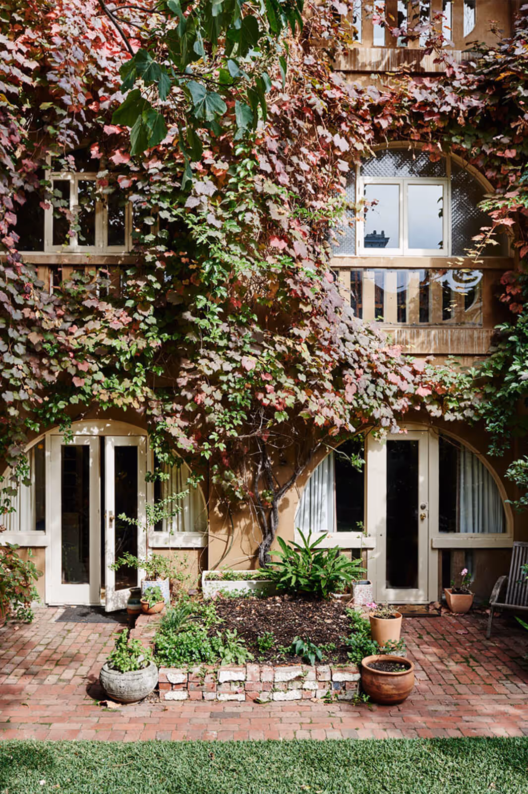 The lounge room features layers of textiles, rugs and beautiful deconstructed linen couch to laze on with many cushions to make sure you are extra comfortable. A unique rope chair, as well as collected art-works, vintage collections, original rustic floor boards, lots of windows and loads of 1920s character. We have hidden a few essentials from view, (TV, Wireless Sonos speakers for your choice of music) all looking over the private communal garden to share. The apartment is on the top floor via a spiral deco staircase with a small balcony featuring lots of plants and chairs to laze on. The space is light and bright and has wonderful views over a private garden.